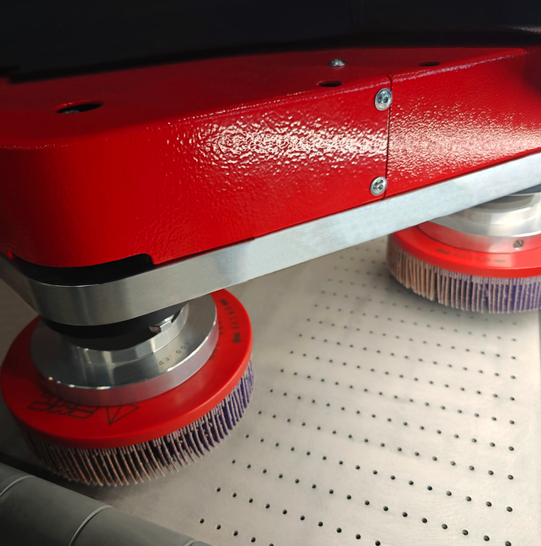 Parts are automatically conveyed through the machine via a precision-controlled conveyor belt. As they pass beneath the rotating discs, surfaces are treated thoroughly. Once processed, the parts exit the machine ready for collection—no manual handling required during operation.